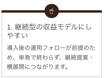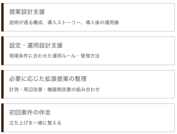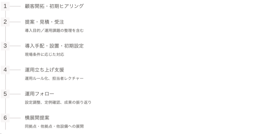 ✔︎ 提案〜導入〜運用フォローまで一連の業務を実行できる体制があること