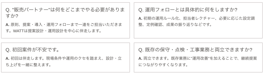 WATTは、販売パートナー様の活動がスムーズに回るよう、提案設計・運用設計の支援を行います。